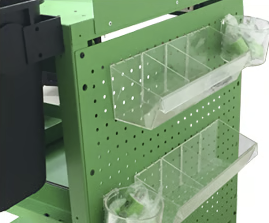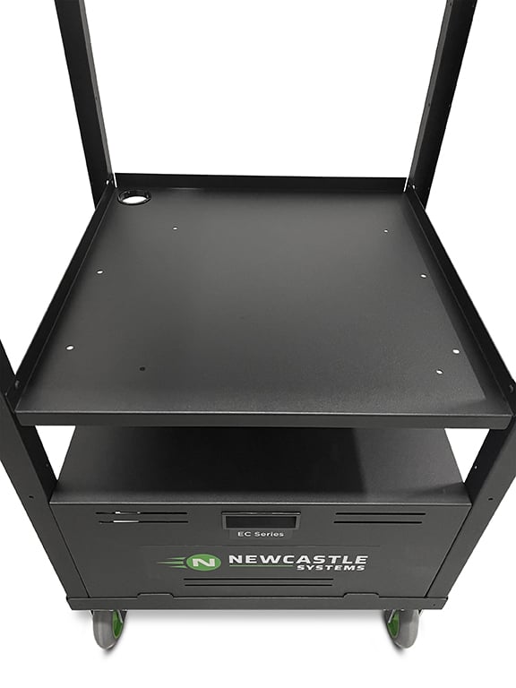 The EC102NU2M comes standard with: (1) top shelf, locking casters, front push handles, wastebasket and holder, integrated power dock, (2) swappable battery packs, and (1) battery charging station